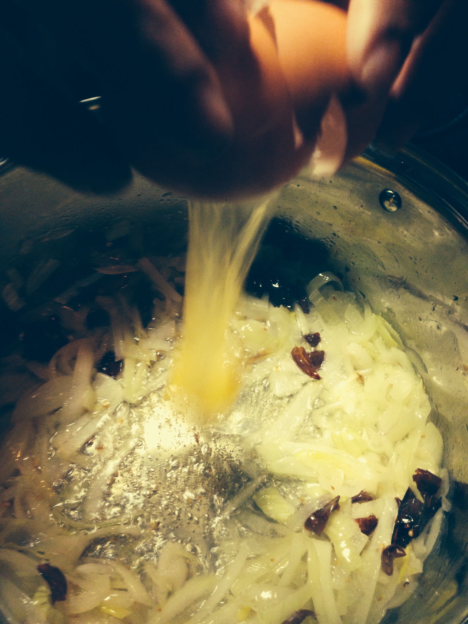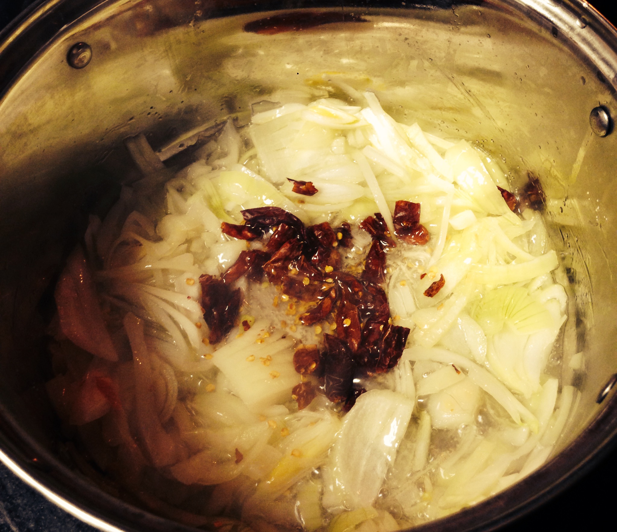 3. As the onions brown, take the dried red chilies and cut them so the pepper flakes are out of their skin. Then add them to the onions.