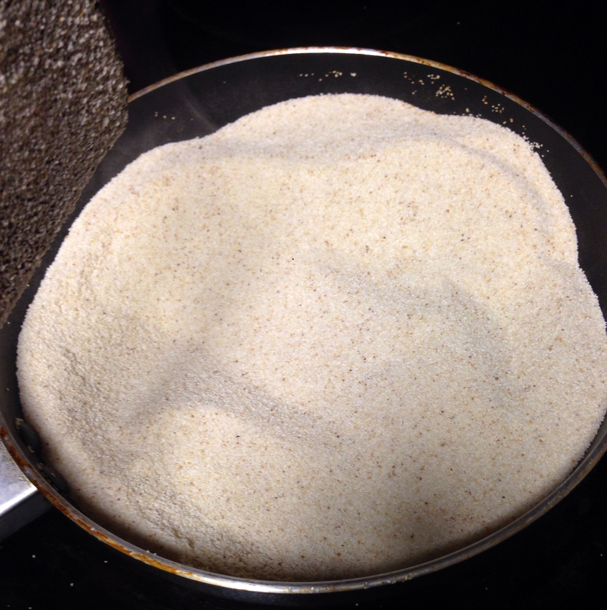 1. Start by taking the farina and sauteing it in a pan. (No oil). After a few minutes (roughly 5-6 minutes on a medium heat) of tossing it around, pull away from the heat and set it aside.