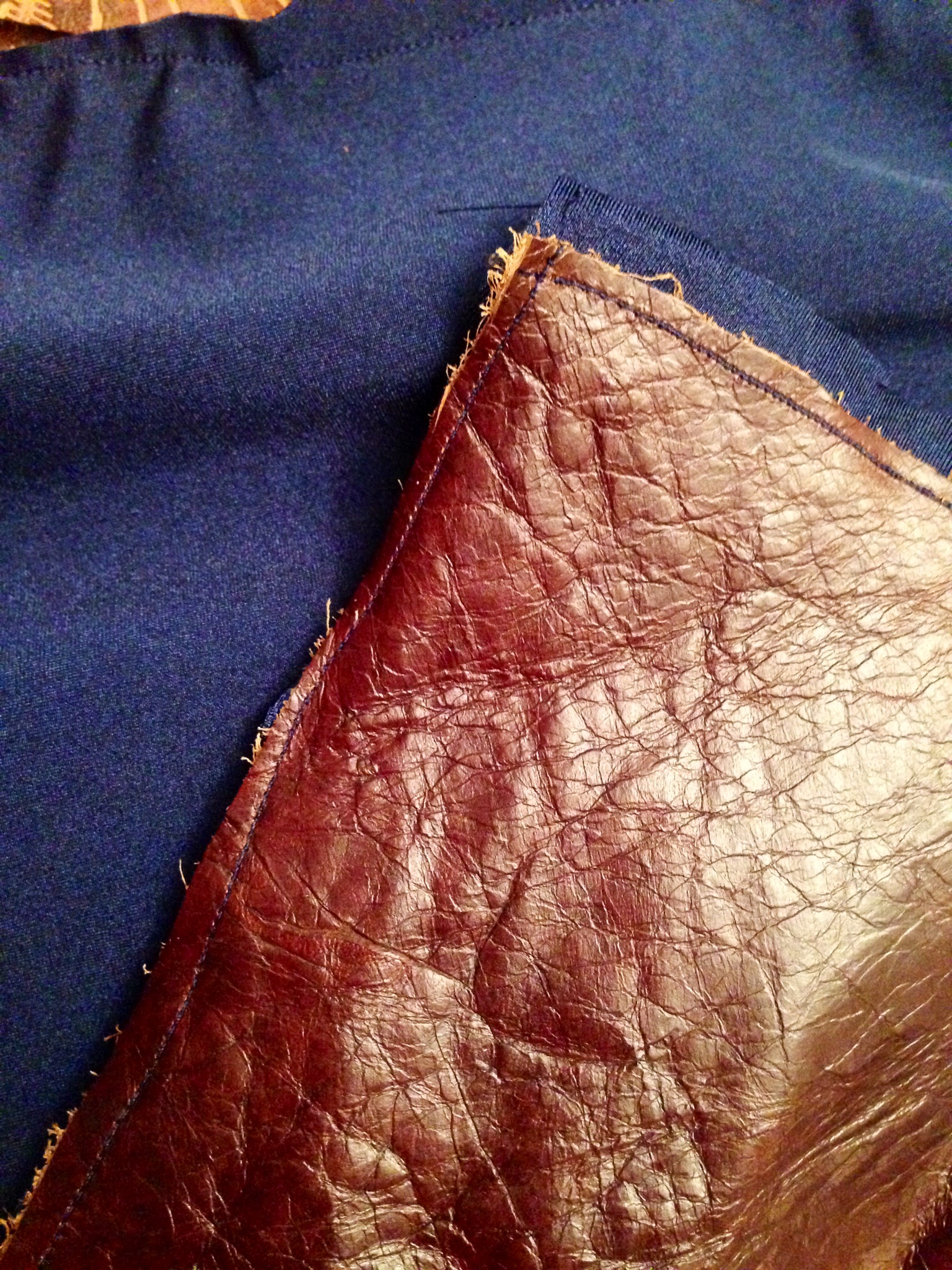 Step 1: Start by adding the lining to the pocket piece. I sewed it to have the embossed leather and lining have a fine finish rather have the sew patten shown. I did that for 3 of the four sides. I then flipped it right-side out and closed the last part by sewing on top. (I couldn’t figure out how to do all four sides as it is leather, so I decided to close the fourth side that way). Don’t forget to remove the excess lining fabric.