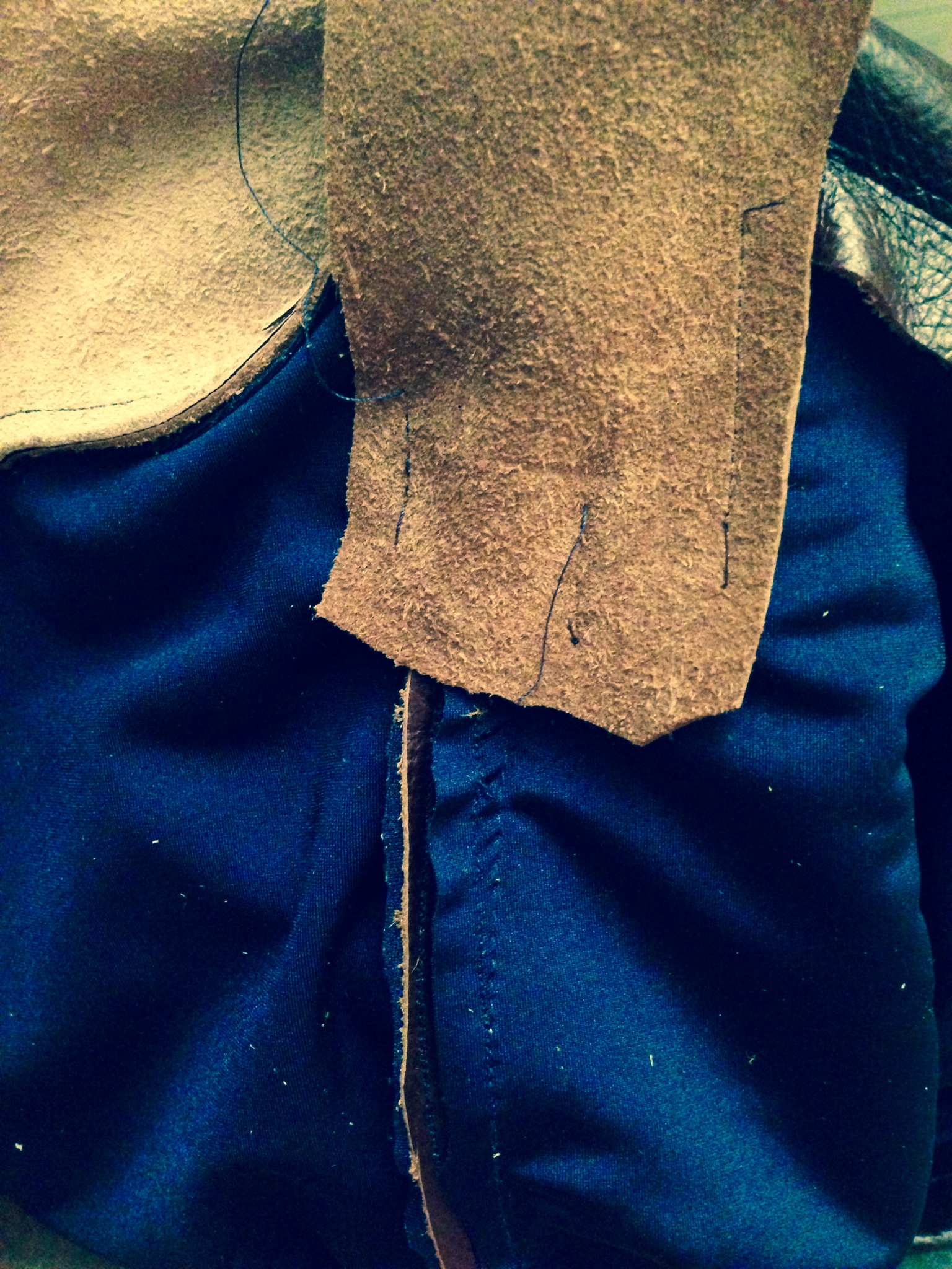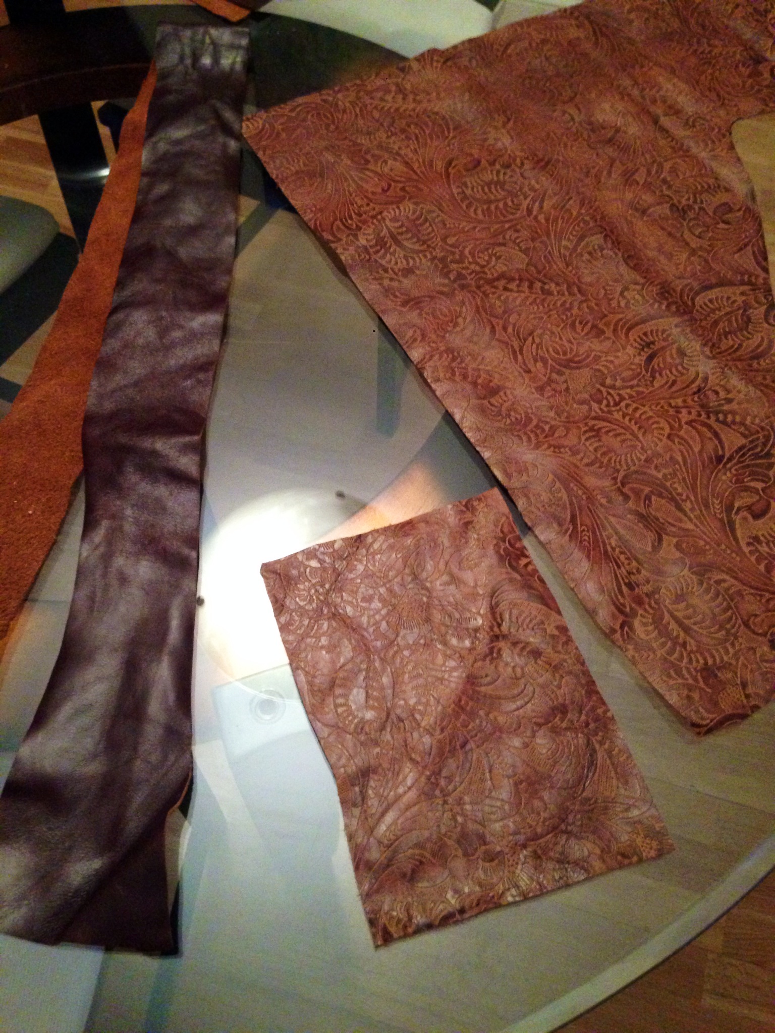 Now that the pieces are all cut, it is time to sew. I just recently got a machine for my birthday and I haven’t used it until this project. That was extra exciting. I bought a denim needle to be able to handle the thickness of the leather. From the photos, you can see the leather is not hard or thick. There are leather needles, but Michael’s didn’t have it. 😦
