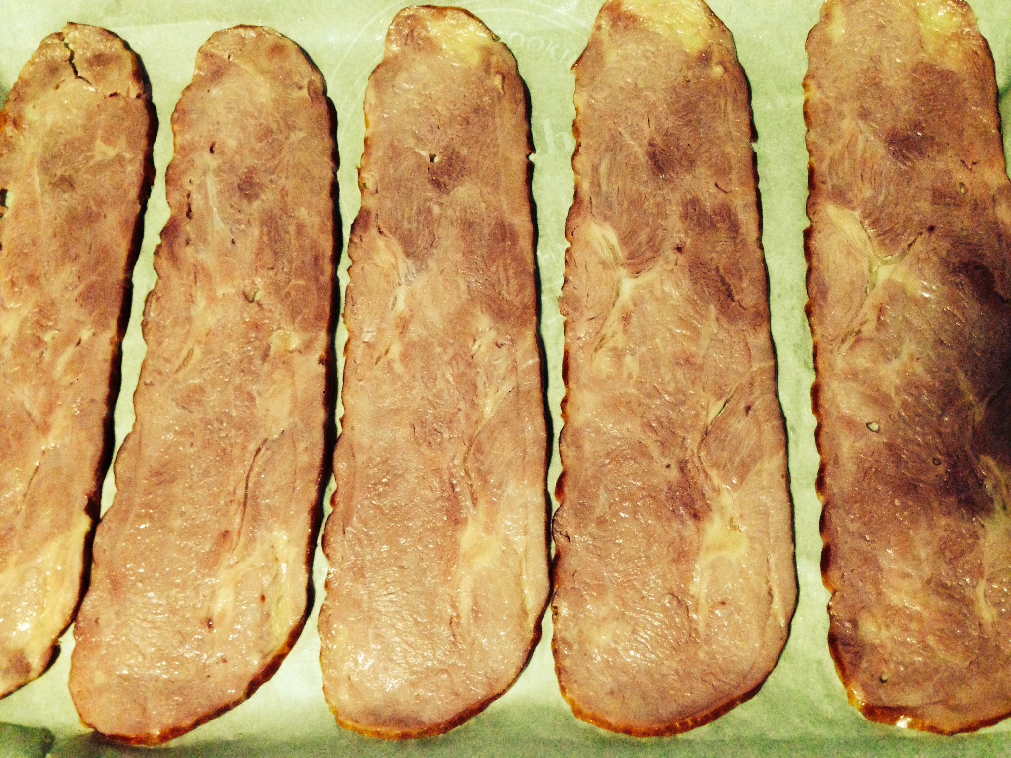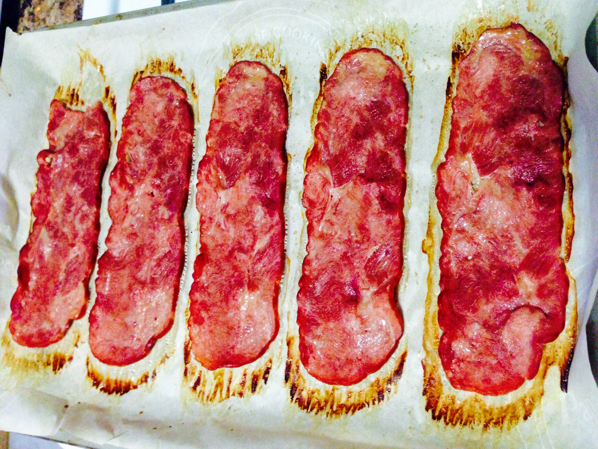Step 1: Pop your turkey bacon into the oven. Be sure not to cook them through. (They will be added into the quinoa later).