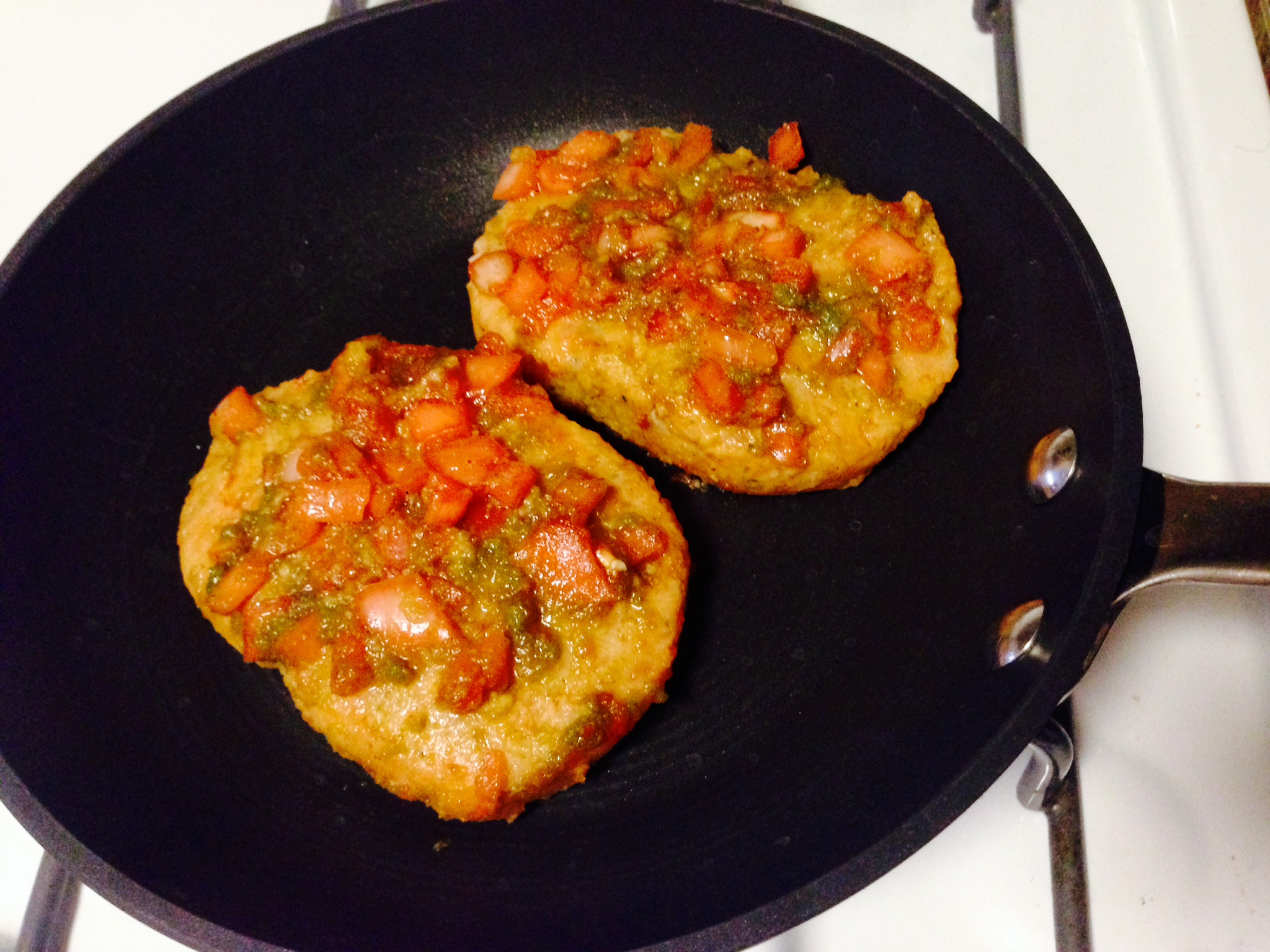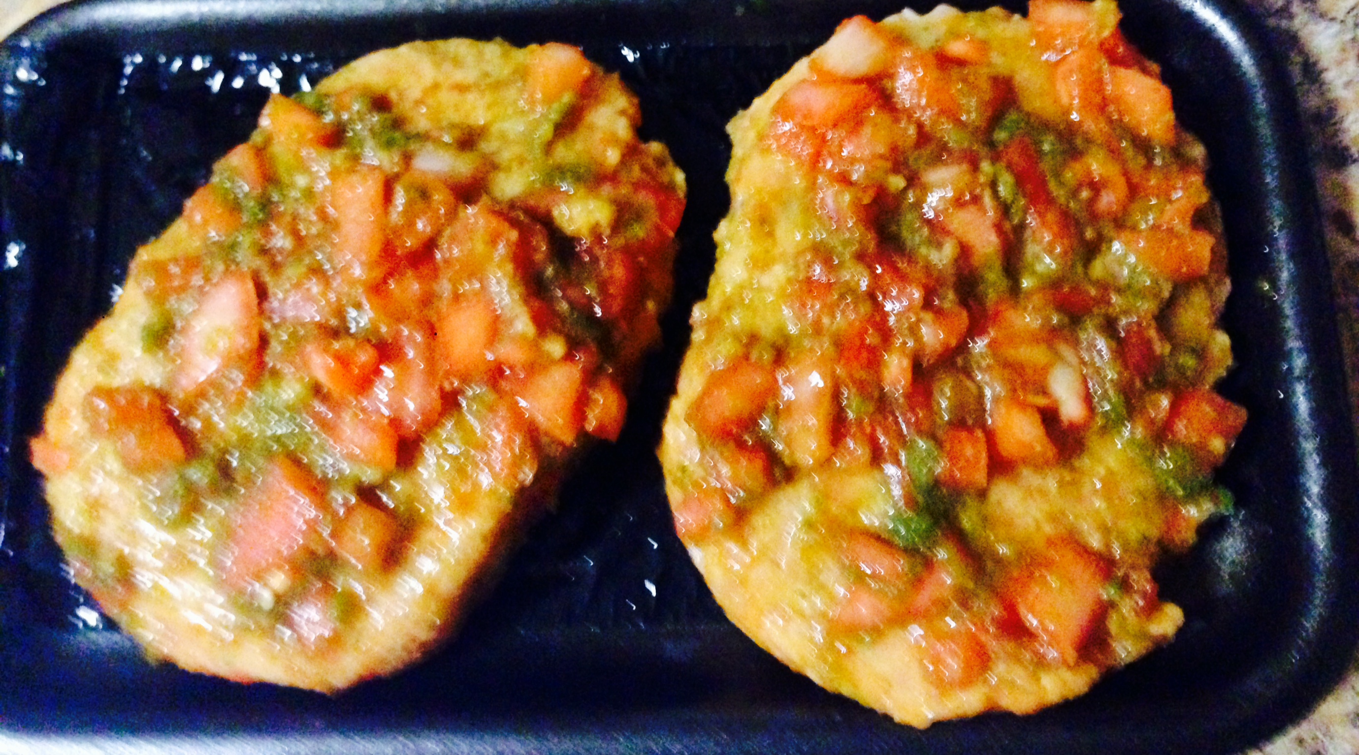Step 4: Mix a small amount of olive oil, ground basil and ground parsley together. Add the diced tomatoes and toss it in. Marinade the salmon burger and set it aside.