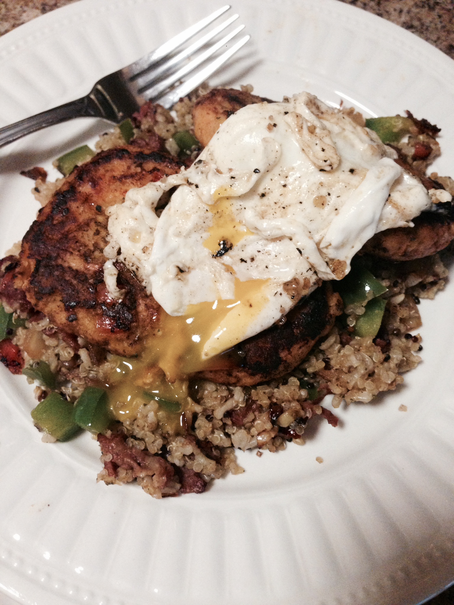 Step 11 : I layered the quinoa and then added the salmon on top. This is when I got experimental and added an over easy egg on top! It was delicious!