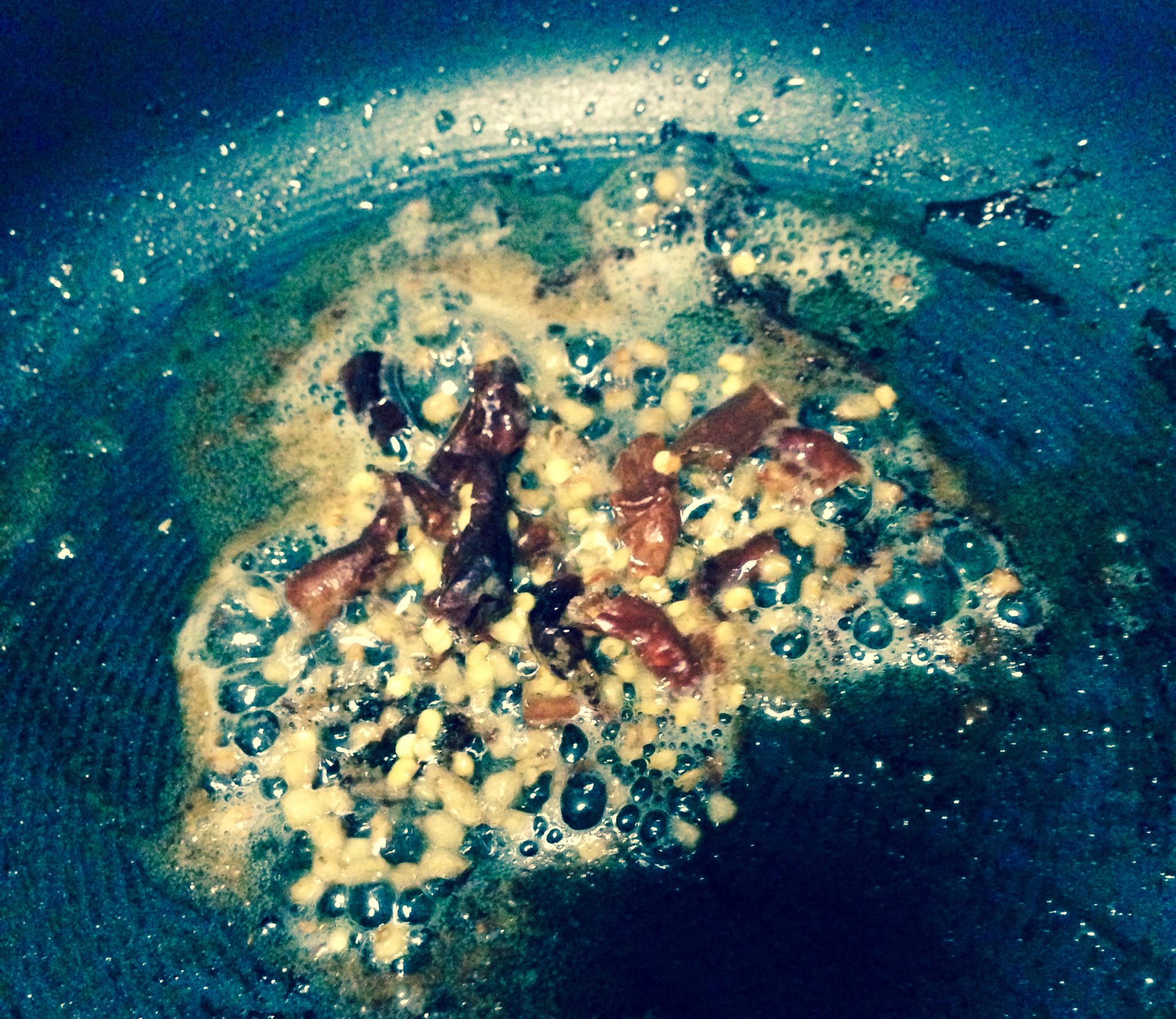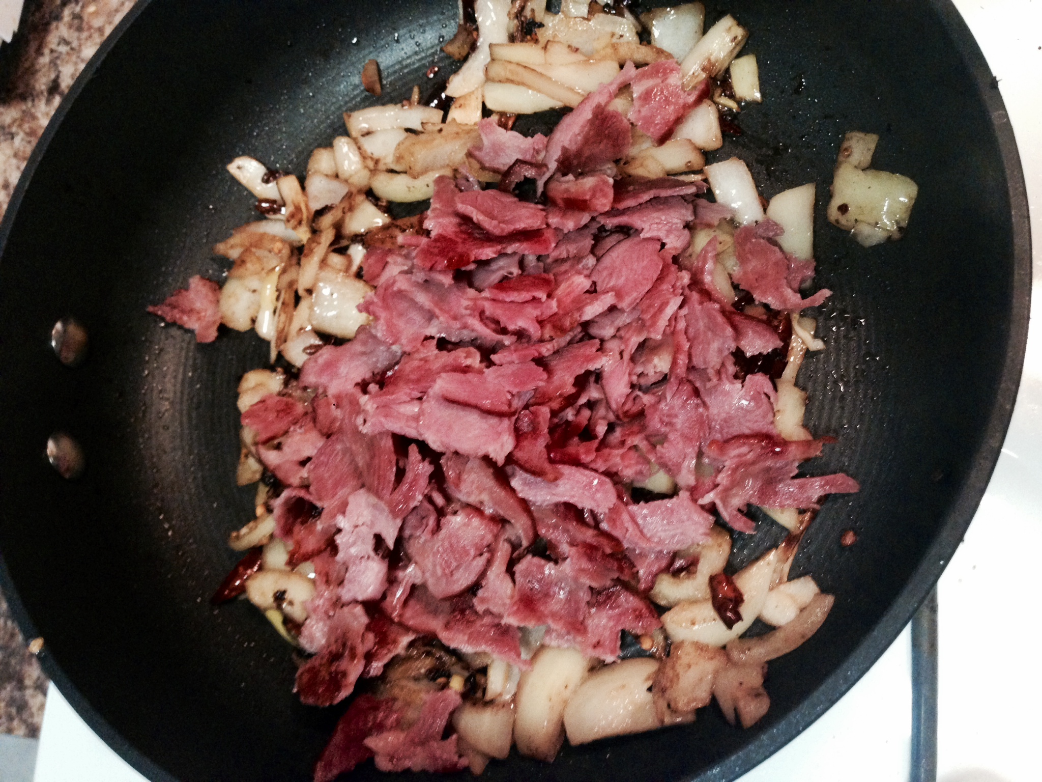 Step 8: In a larger stove top pan, add butter and garlic. Saute it. Add red chilies if you want. Then, add the onions. Saute it. After a few minutes, add the bacon. Saute that and make sure you are constantly tossing it around. Lastly, add the green peppers. Again, toss it around and make sure the bacon is thoroughly cooked.