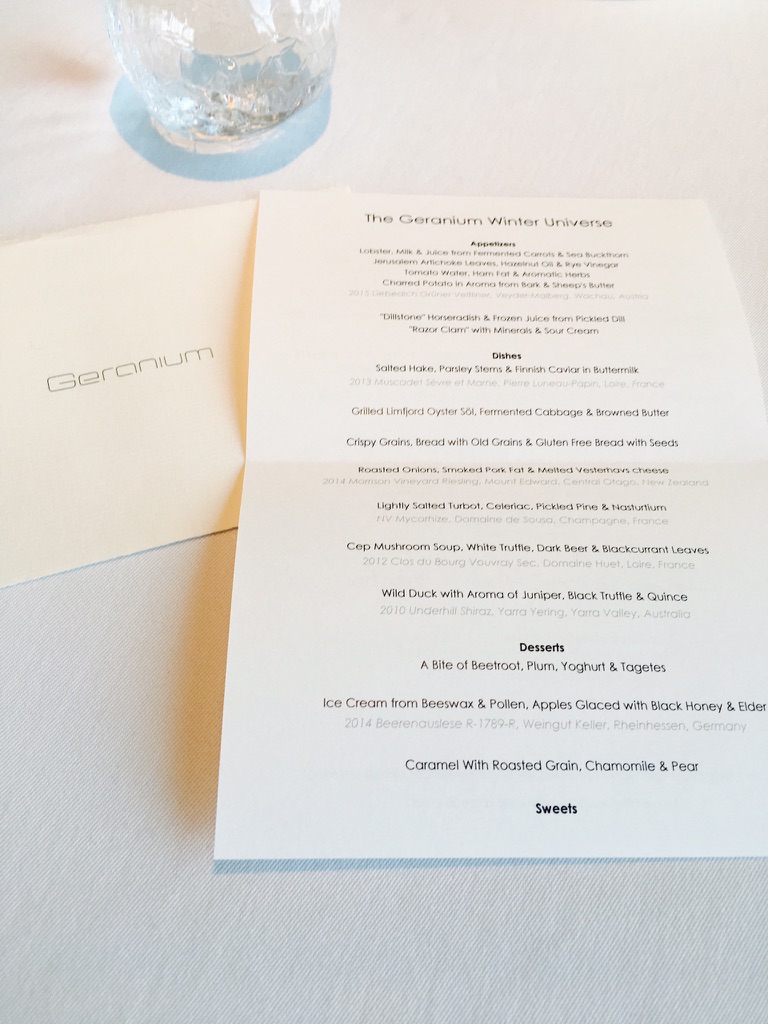 Geranium was a smaller restaurant with open kitchen concept. The seats at the tables were all facing the kitchen. Once seated, we are handed an envelope filled with the glory that is to come; a 16-course arrangement of symphonic commons that go far beyond your imaginations. Be warn, some may seem out of the norm and bring confusion, but that’s the idea; to expose your senses to something different.